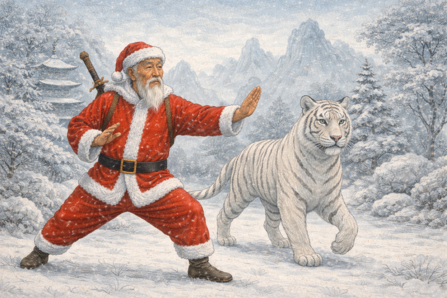 Before departing, Santa befriended a white tiger whose stripes shimmered like calligraphy. Together they practiced stepping methods at dawn. Yet the tiger, bound to the veins of China, refused the northern winds. With mutual respect, they parted.
